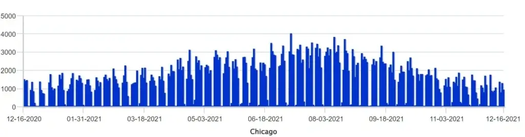 On the Domestic product, rail services have been market-focused with the intention of maximizing network velocity, specifically car and container turn-times. Certain metro areas have had volumes metered inbound to avoid rail ramp congestion gridlock as chassis and parking constraints reached critical points. Drayage demand for the Chicago metro area is shown below and has been on a gradual decline as have moved through Q4 2021.